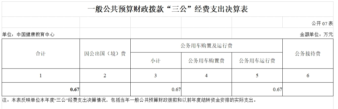 中国健康教育中心2020年度“三公”经费决算数为0.67万元,其中:公务用车运行费0.67万元。
