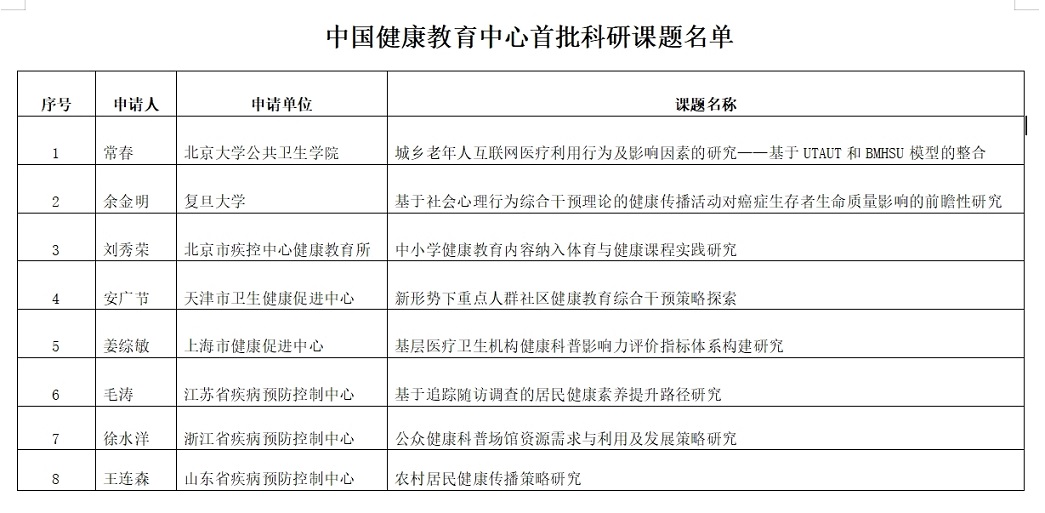 中心面向全国各省级健康教育专业机构和有关高校开展了研究课题征集工作,共收到15个省市和2所高校提交的30份申报书。经过形式审查、线上答辩、外部专家评审打分、综合评议等环节,最终推选出8个申报项目作为首批支持的研究课题。综合评审认为,以上课题紧密结合实际工作需要,选题具有较强的理论和实践意义,课题设计合理,技术路线可行,预期产出明确,研究基础较好。